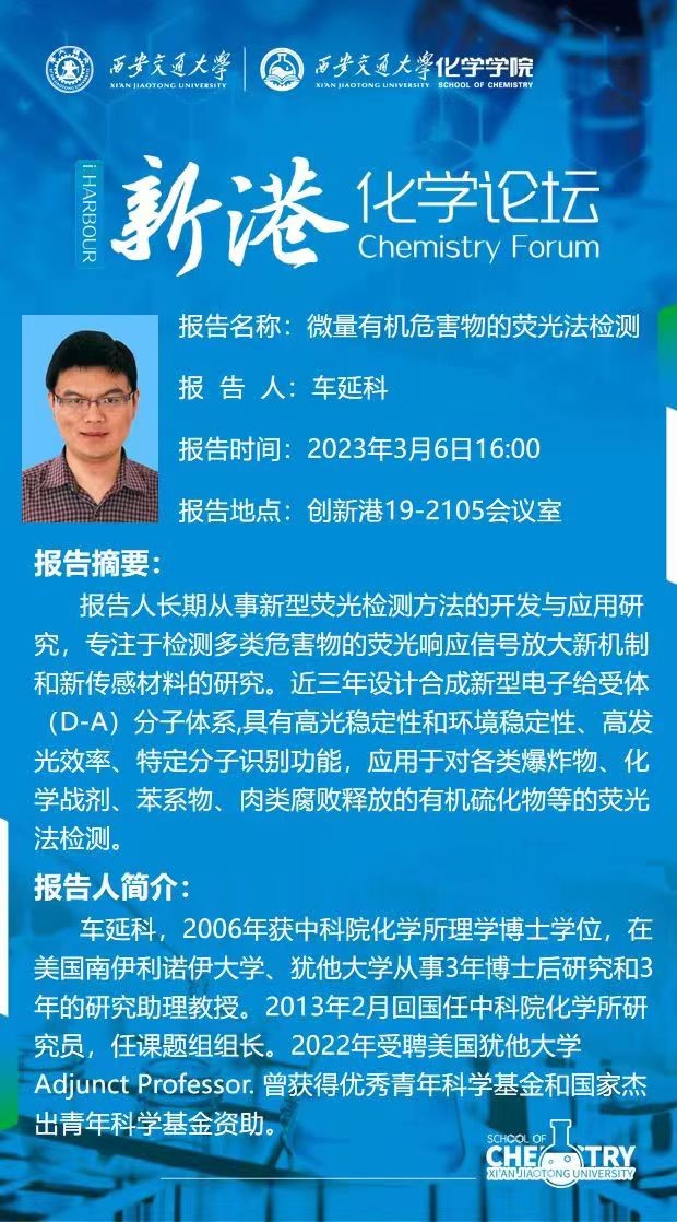 春光无限好,科研正当时。为提升必赢唯一官方网站学生基本科研素养,加强教师间学术交流合作。3月6日下午,应必赢唯一官方网站邀请,中国科学院化学研究所车延科研究员进行了题为“微量有机危害物的荧光法检测”的报告。本次报告由院长丁书江主持,张志成书记、张彦峰副院长以及学院相关研究方向教师和学生参与学术交流。
