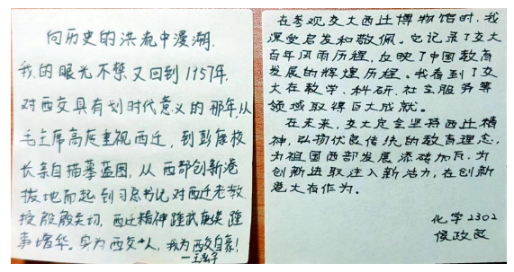 一小时的参观虽短暂,但这段体验却给每位同学留下了深刻的印象。“听党指挥跟党走,与党和国家、与民族和人民同呼吸共命运。”老一辈交大人的事迹仍历历在目,总书记的教诲仍在耳畔回荡,西迁精神”已深深刻进“新交大人”的血脉,同学们也必将不负期望,做好西迁精神新传人,在民族复兴的伟大征程中书写新篇章!