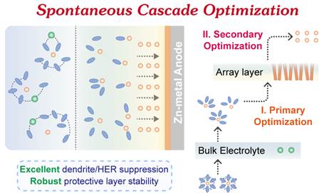 水系锌离子电池具有安全性高、成本低、环境友好等优点,是应对当前能源和环境危机的重要新型储能技术。然而,锌负极存在枝晶生长、析氢等不利副反应,严重阻碍了锌金属电池的实际应用。在负极表面构建保护层被认为是解决以上问题的有效手段,然而目前单一的保护层很难在较短时间内实现对大量溶剂化Zn(H2O)62+的完全脱溶,此外,复杂的去溶剂化过程和均匀离子通量需要同时在保护层内完成,在长时间的电镀/剥离过程中,具有双重的压力的保护层一旦被击穿,锌负极就将再次暴露在水系电解液中,使保护层失效。因此,传统的保护层很难通过单层优化有效地完成Zn2+去溶解和均匀Zn2+通量的双重挑战。这导致锌负极的稳定性有限,无法突破实用锌离子电池中低 N/P 比的限制。